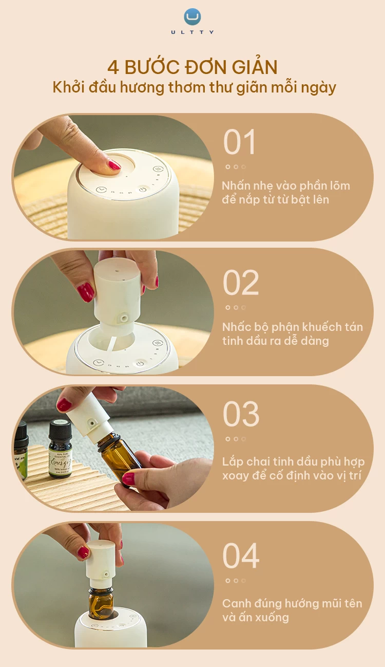 - Tương thích với 90% tinh dầu nguyên chất (quế, cam ngọt, oải hương...), ULTTY AROMA mang đến trải nghiệm hương thơm đa tầng, bao phủ không gian bằng sự thư giãn và khơi dậy sự tĩnh tại trong từng không gian sống.