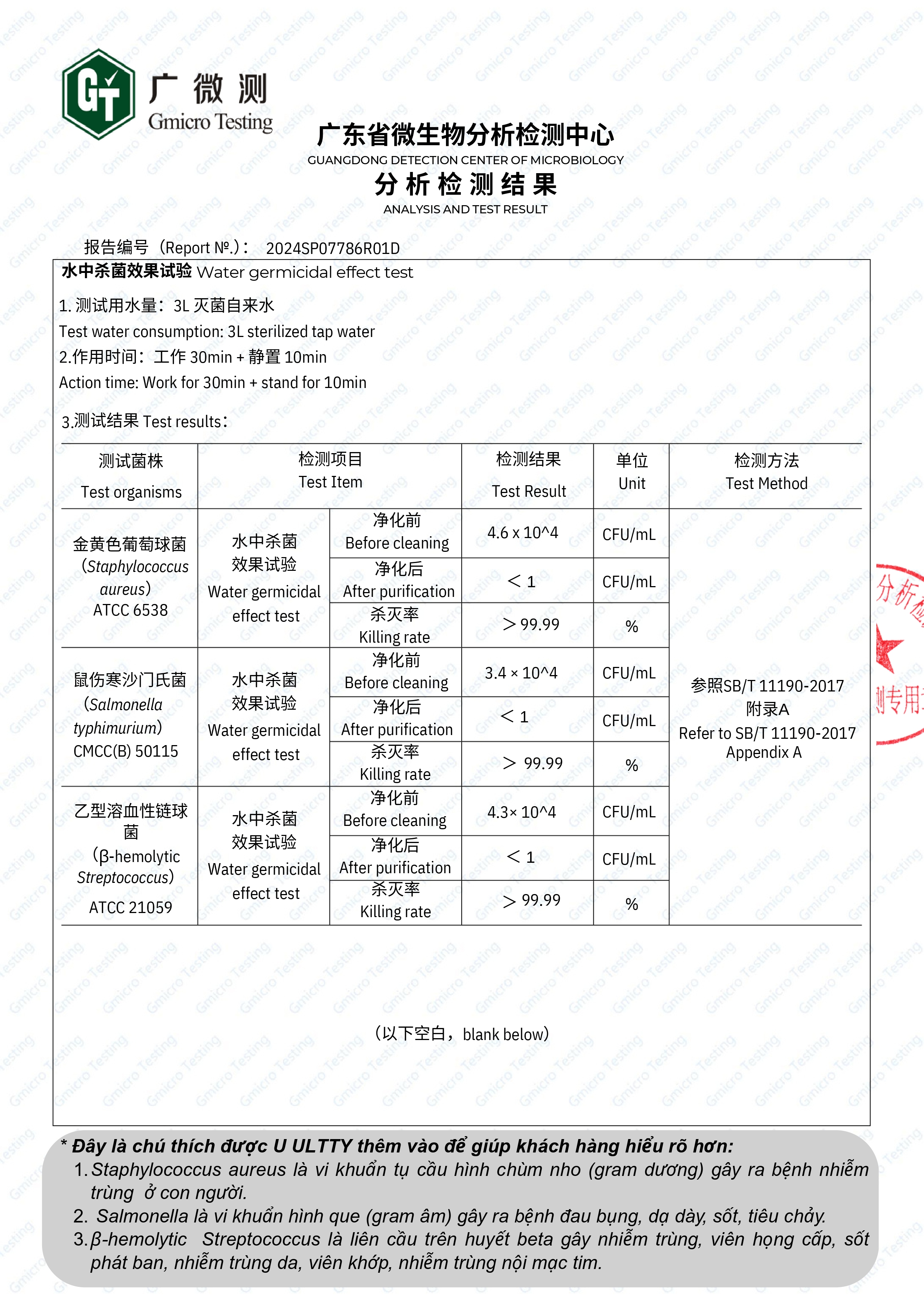 Các chủng vi khuẩn nguy hiểm như Staphylococcus aureus (tụ cầu vàng), Salmonella, và B-hemolytic streptococcus (liên cầu tan huyết) đều được ULTTY WFX loại bỏ đến 99,99%, ngăn ngừa ngộ độc thực phẩm và bệnh truyền nhiễm qua đường ăn uống.