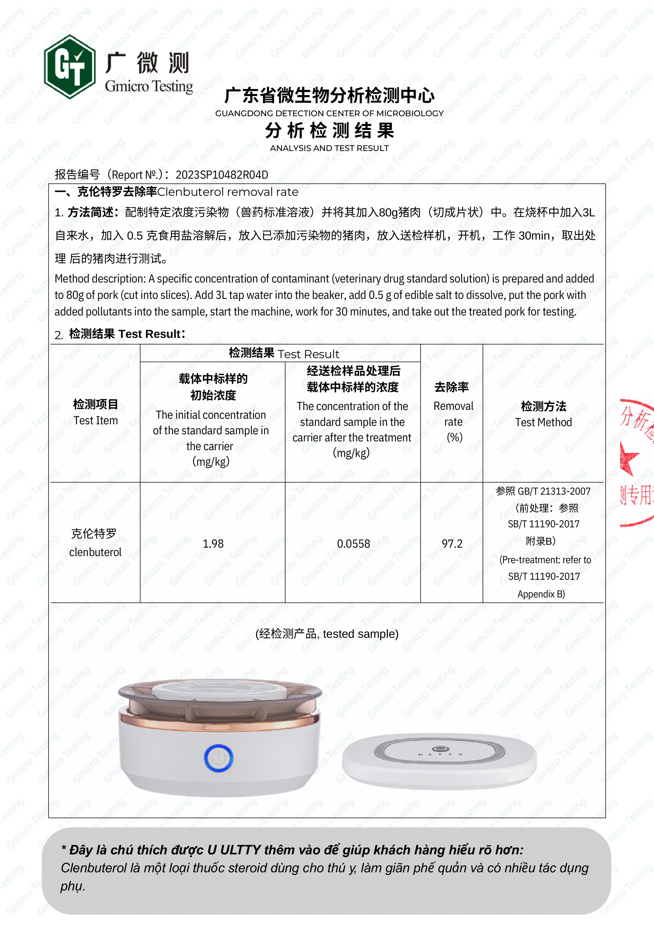 - Clenbuterol (chất cấm tăng trọng): Khử sạch 97,2%